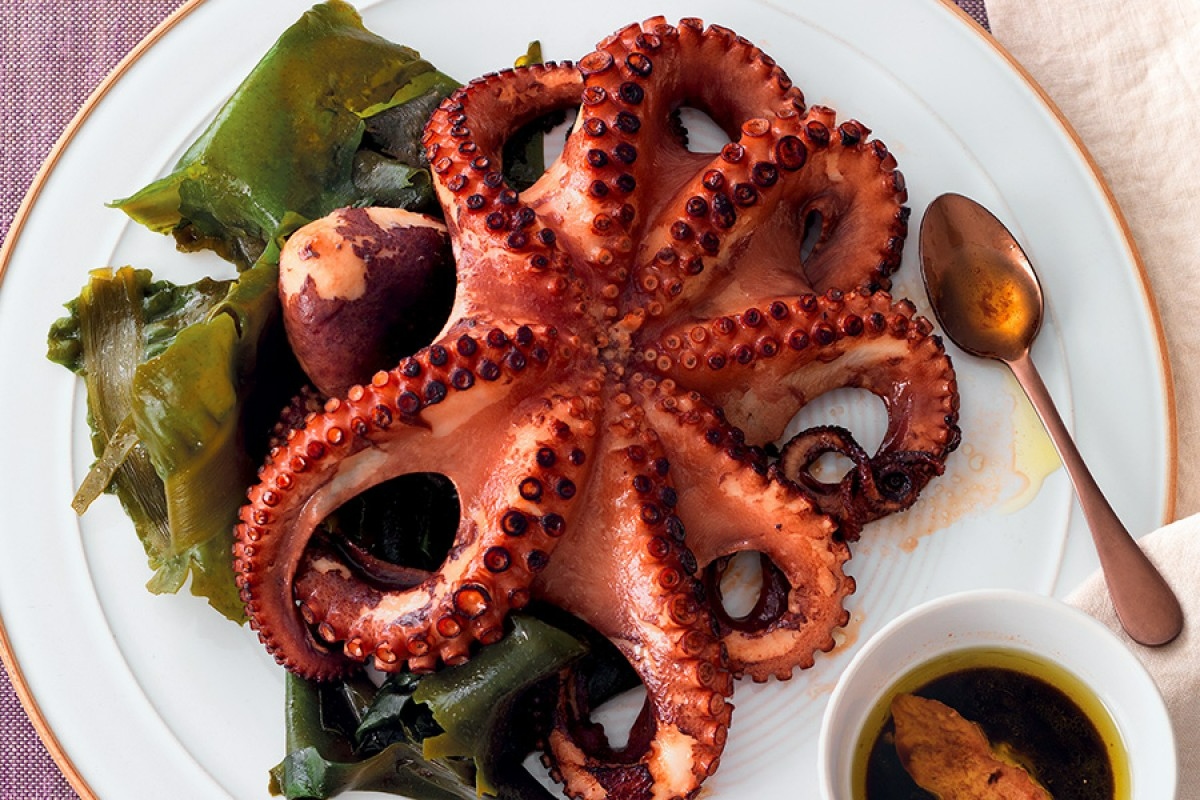 Per servire, Dabiz Muñoz taglia il polpo a fette spesse e lo adagia sulla crema di patate. Aggiunge alcune foglie di spinaci per dare freschezza e croccantezza, più parmigiano grattugiato, un filo d’olio d’oliva e qualche goccia di aceto di Sherry per esaltare tutti i sapori.
